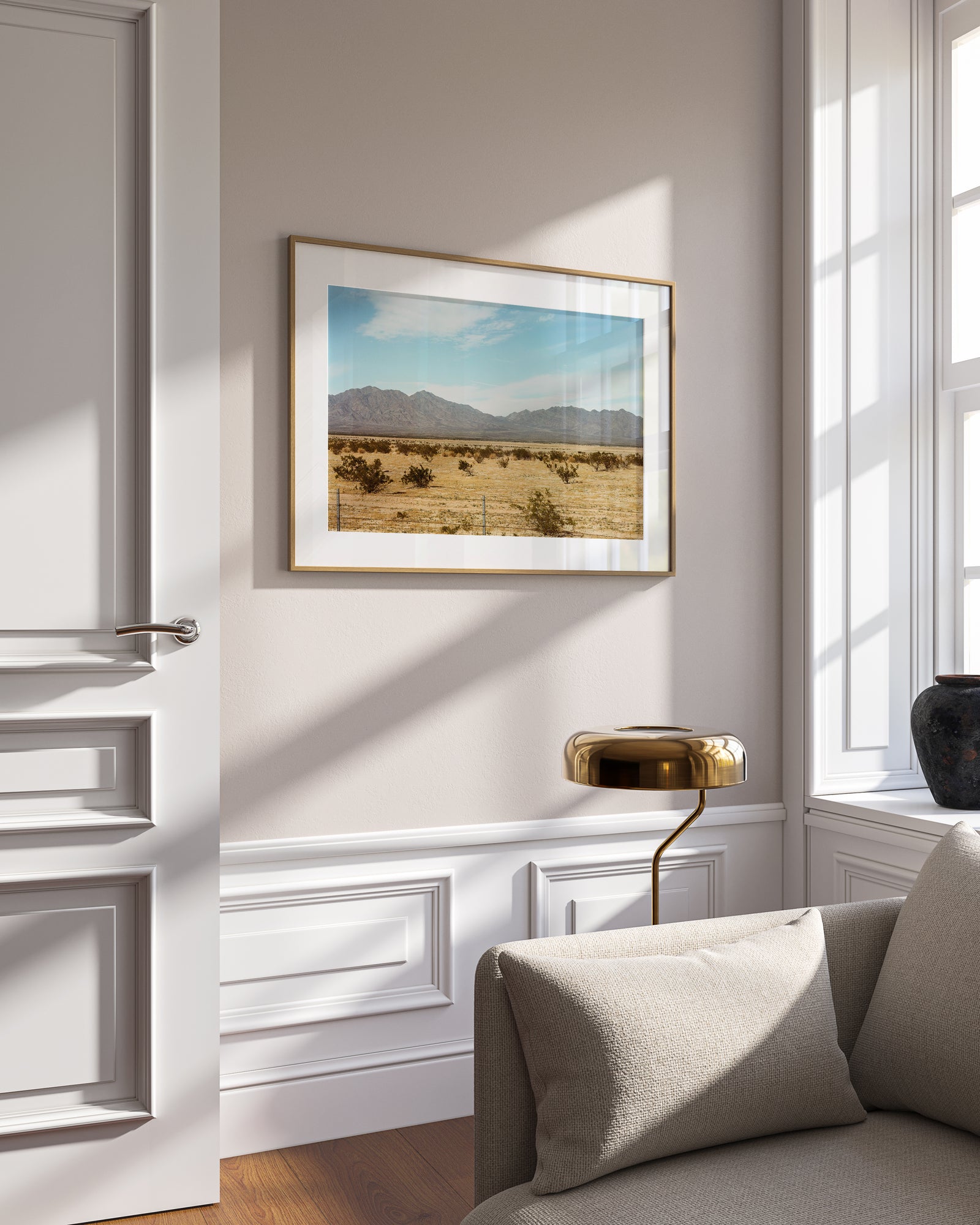 The framed artwork will be shipped and delivered fully prepared for effortless hanging.